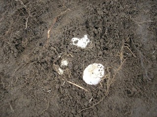 I marked each one by one - with a nontoxic marker. An X on each egg. I carefully excavated the area around each egg with the paintbrush and my fingers. (Make sure you wash your hands before and after this procedure - should you need to do it.) Remember, the eggs absorb things - (air, water, etc) you don't want to use poisonous substances in this process. Below, you can see one of the eggs, marked with an X - and a few roots around it. The roots were hard to get through, but of course worth every minute of it.